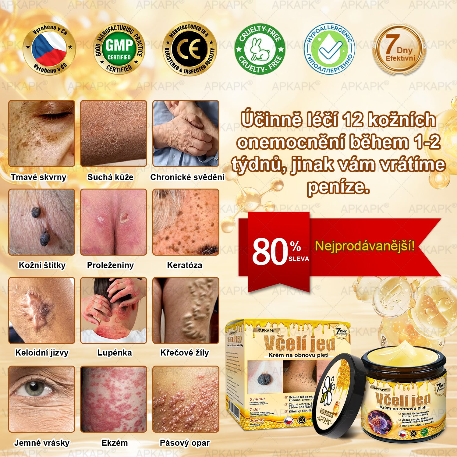 „Utratila jsem více než 12 680 Kč a strávila nespočet hodin v dermatologické klinice, kam chodzę już 2 lata, ale výsledky byly sotva viditelné. Teprve když mi kamarádka doporučila APKAPK™ Komplexní krém s včelím jedem na vrásky, rozhodla jsem se ho vyzkoušet — moje předchozí drahé přípravky už stejně docházely. Byla jsem upřímně překvapená, když jsem po krátké době viděla, že moje pleť začíná být jasnější a zdravější. Po spotřebování asi pěti balení se změny staly ještě výraznějšími — pleť byla sjednocená, zářivá a mé vrásky i stařecké skvrny zmizely téměř z 99 %! Budu v používání pokračovat, protože moje pleť konečně vypadá mladší a cítím se skvěle.“ — Eva Nováková